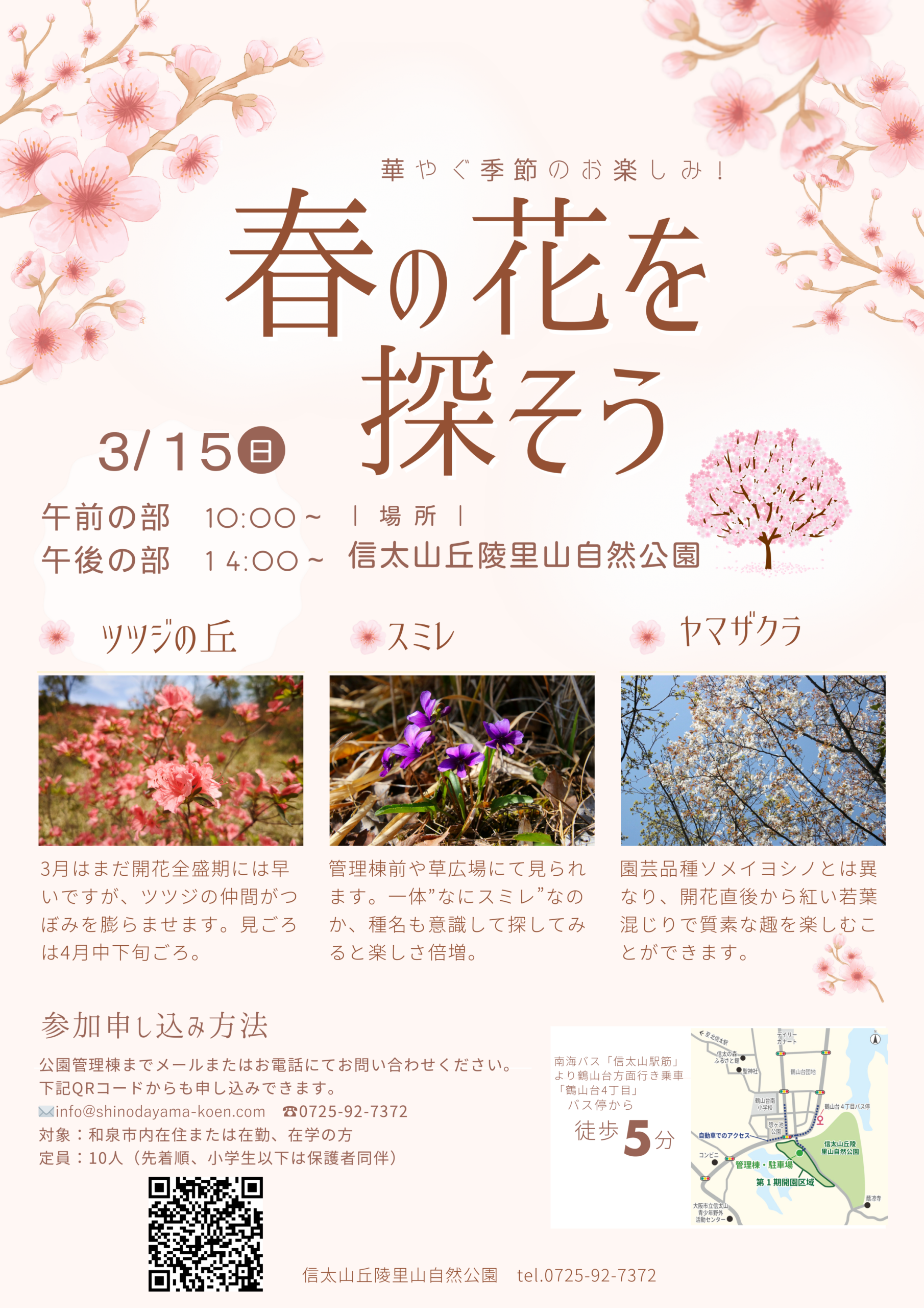 【募集中】 3/15(日)「春の花を探そう」を行います スミレなど、一足早い春の訪れを感じさせる花々の開花を公園で観察しましょう。 開催日:3月15日(日) ■対象:市内在住または在勤(学)の人 ※小学生以下 |