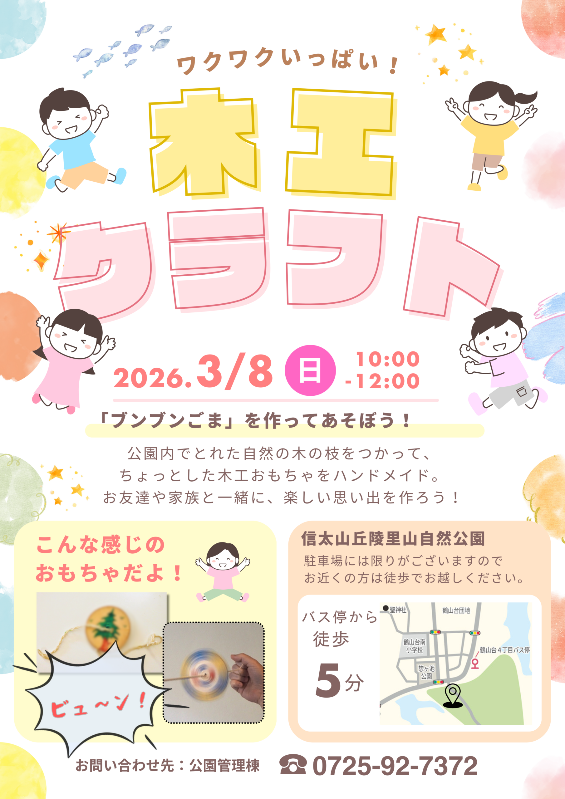 【募集中】 3/8㈰ 木工クラフトを行います 公園内でとれた自然の素材を使って、ちょっとした木工おもちゃ(ブンブンごま)をハンドメイド。 開催日:3月8日(日) ■対象:市内在住または在勤(学)の人 |