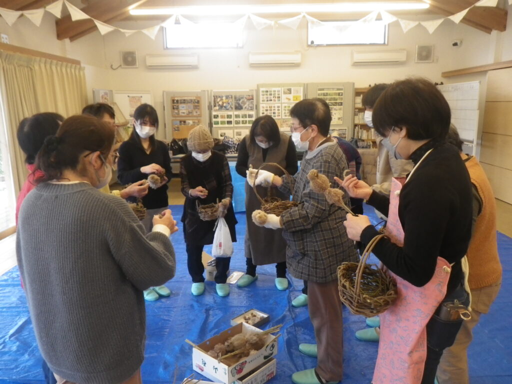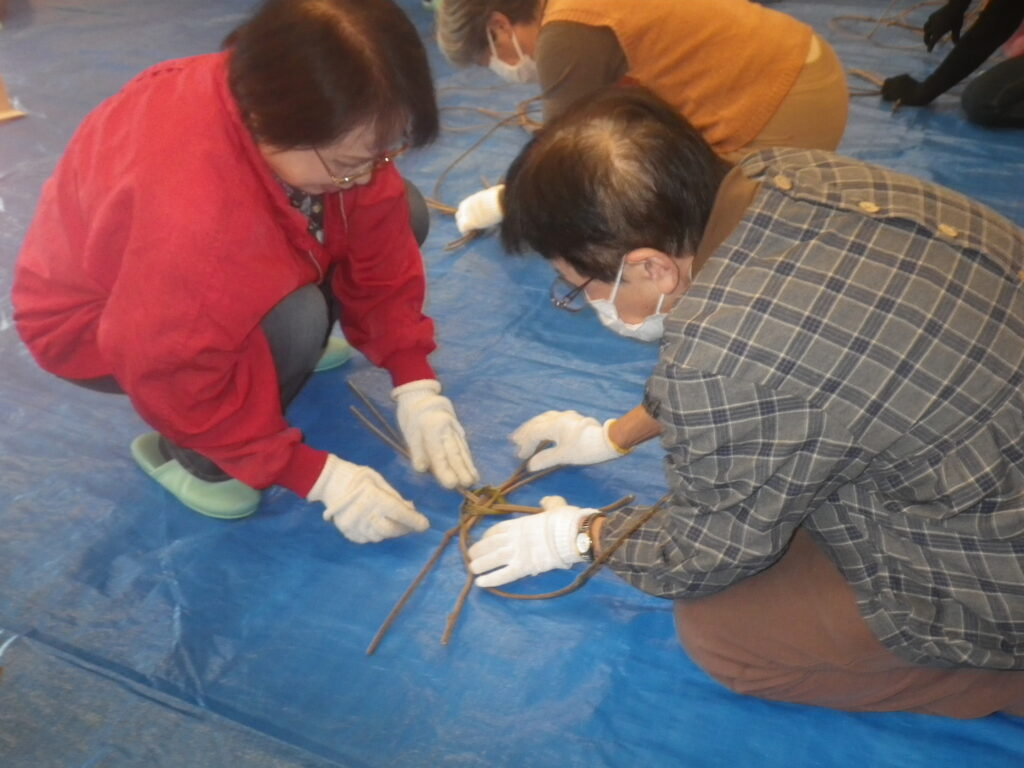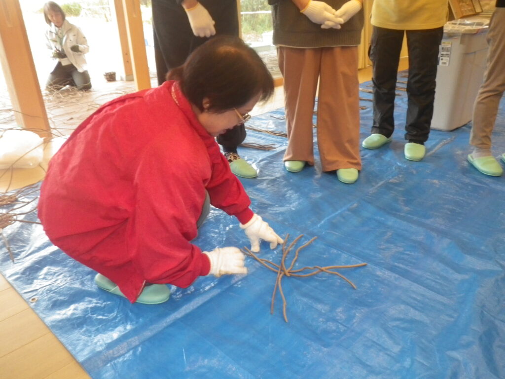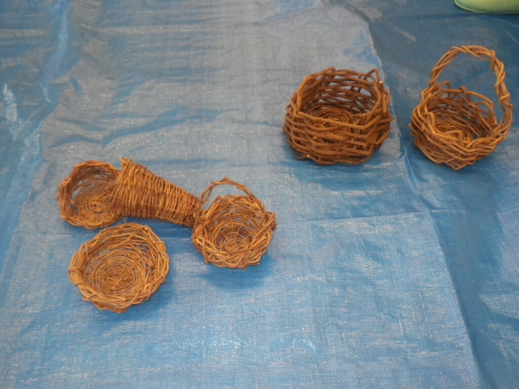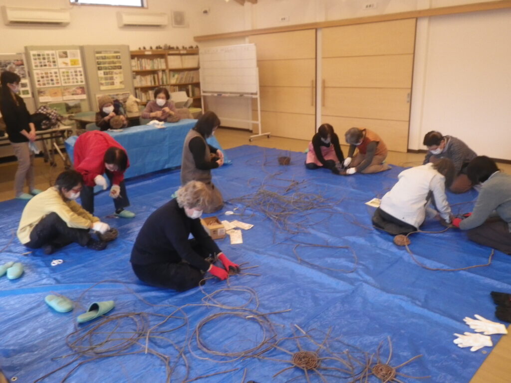 公園内で採れた葛のツルを手で編み込んで、トイレットペーパー入れ程度の大きさになる小物入れのつるかごを作りました。