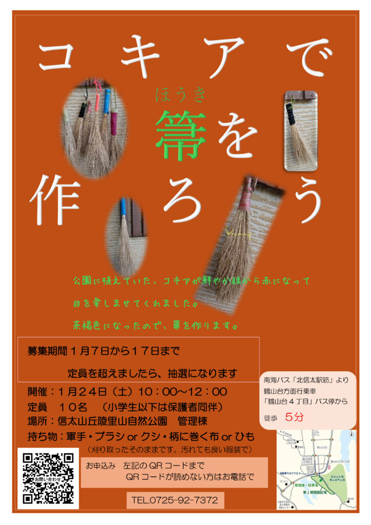 公園内で育てられ収穫乾燥された園芸植物・コキアの穂を束ねて、竹箒よりも粘りとコシが強いともいわれる、コキアほうきを手作りしましょう。