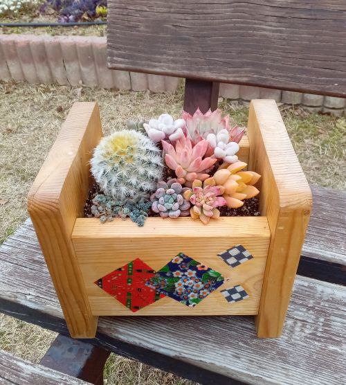 木製のプランターに華やかなペーパーナプキンなどでデコパージュし、かわいい多肉植物を固まる培養土を使って寄せ植えしていただきます。