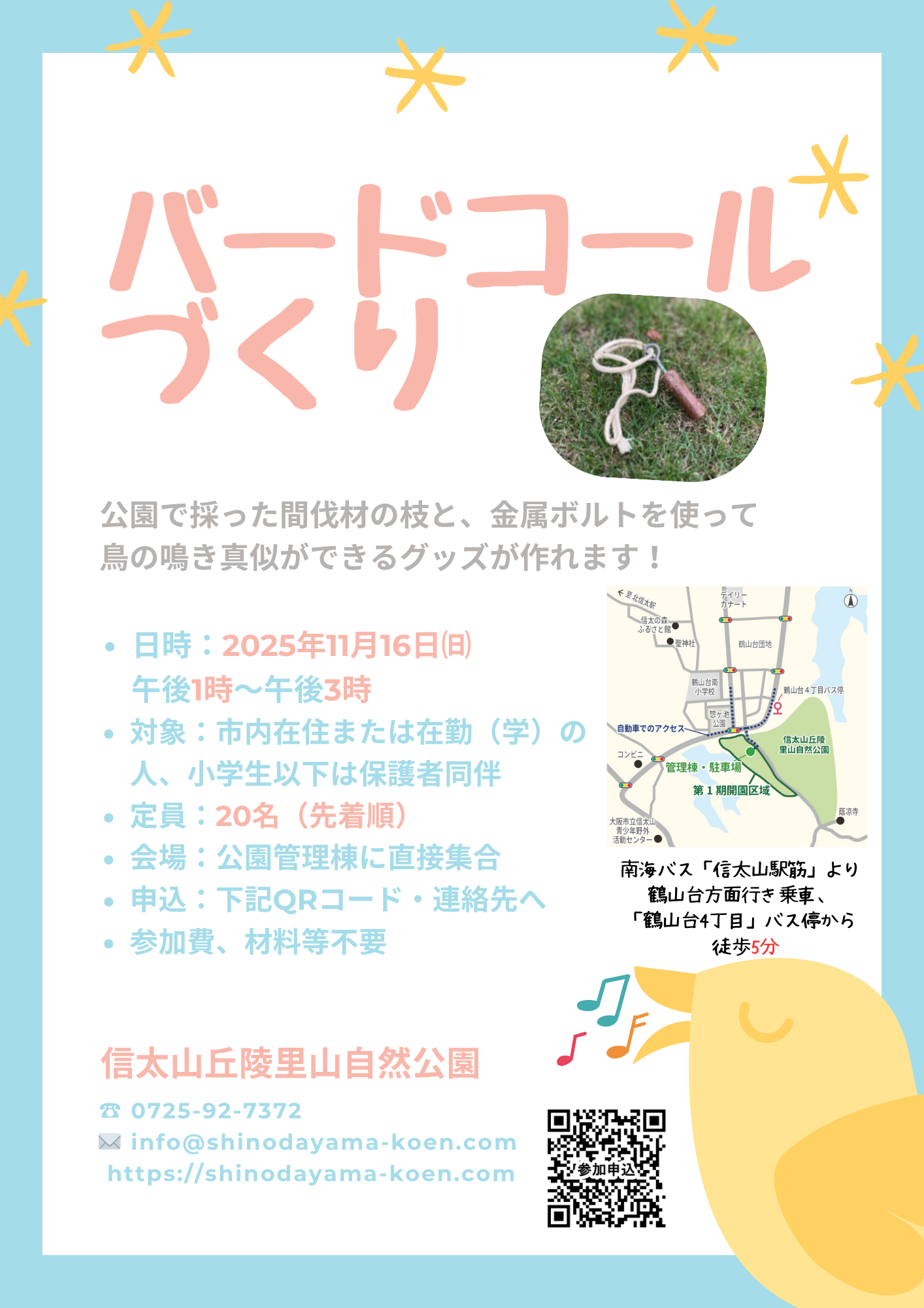 【募集中】 11/16㈰ バードコールづくりを行います 鳥の鳴き声に似た音をこすって奏でるおもちゃ楽器「バードコール」。こちらを実際に作って鳴らして遊んでみましょう。ご応募をお待ちしております。 ※参加を希望するイベ |